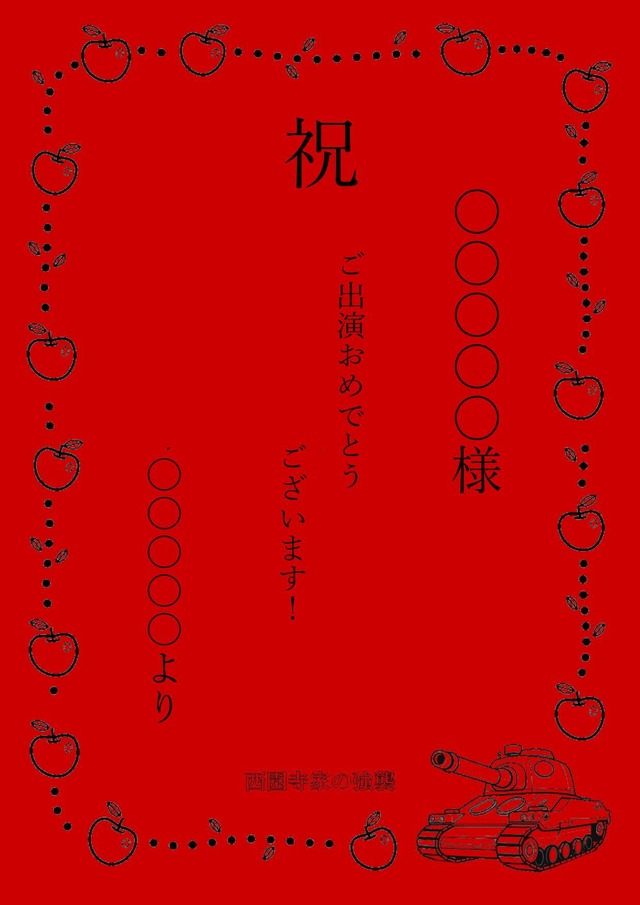 お祝い札/キャストへ贈る応援お祝い札 ★表示されている【発送予定日】は、劇場にて掲示後の、お客様への発送予定日を表示しております。 《予約注文する》にて、確かに公演期間中は掲示されますのでご安心ください。★ 価格:3,000円 サイズ:A5サイズ(148mm×210mm) シート概要:特別厚手シート(色上質紙・特別最厚口0.19mm) 色:5種類(シート:赤・黄・水色・紫・白/文字:黒) ※白シートのみ文字はピンク字となります メッセージ:30文字以内 受付期間:4月12日(日) 23:59まで ◇キャストの直筆サイン入り! こちらでは、出演者への「お祝い札」をお送り出来ます。(こちらの商品のみ、食品差し入れではありません) ロビーにフィルム包装にて掲示、終了後は送り宛キャストの直筆サインを入れて、シートを郵送にてお手元にお贈りさせて頂きます。 キャストへの応援に、是非メッセージはいかがでしょうか。 ★★★★★ 感染症対策の一環として皆様からのお祝い花をお受け取りすることができないため、 出演者へお贈りできるメッセージ入りのお祝い札を実施いたします。 公演期間中はロビーにフィルム包装にて飾らせていただき、 期間終了後には出演者のサインを入れてお手元にお贈りさせていただきます。 こちらでご購入頂くと、お祝い札が公演劇場へ直接、自動でお届けされます。 当ページの見本画像をスライドすると、他のお色も見ることが出来ます。 ※お祝い札の画像はイメージです。色味はご覧の液晶画面によって若干の色味違いがでる可能性があります。ご了承ください。 ※決済後のキャンセルは不可となっておりますので予めご了承ください ★★★★★ 【お客様へ】 ・商品選択時に「応援するキャスト名」を選択頂き、キャスト名を直接入力ください。(1名まで) ・商品選択時に「応援メッセージ」を選択頂き、30文字までメッセージを入力できます。未入力の場合自動で「ご出演おめでとうございます!」にさせて頂きます。 ・「お祝い札に載せるお客様名」欄にご入力いただいたお客様のお名前にて劇場に掲示させていただきます。あだ名や別名での掲載をご希望の方は、こちらに希望するお名前をお書きください。 (万が一、誤字や記入漏れされたお客様は、当販売サイトのお問い合わせよりご連絡ください。お問い合わせへのご連絡を持って、変更の受付完了となります、ご安心ください。) ・ハート記号や半角ビックリマークや絵文字は、文字化けする場合があります。また縦書きになりますので、顔文字は崩れる場合があります。ご注意ください。 ・掲示時はフィルム包装にて飾らせて頂きます。 ・郵送は普通郵便での発送となります。ポスト投函での配達となります。 ・公演終演後、決済画面にてご入力いただいたお客様の宛先にシートを郵送させていただきます。郵送は全公演終了後2週間程度を予定しております。