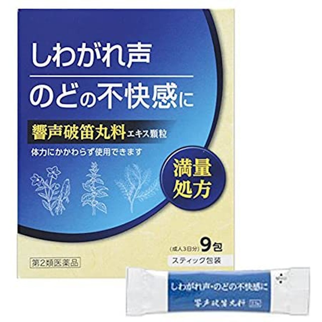 《響声破笛丸料》は、古くから中国に伝わる漢方処方「響声破笛丸」を飲みやすくしたエキス顆粒剤です。普段からのどが弱かったり、声の出しすぎや歌いすぎなどでのどの調子が悪く、しわがれ声やのどに不快感があるときによく効きます。