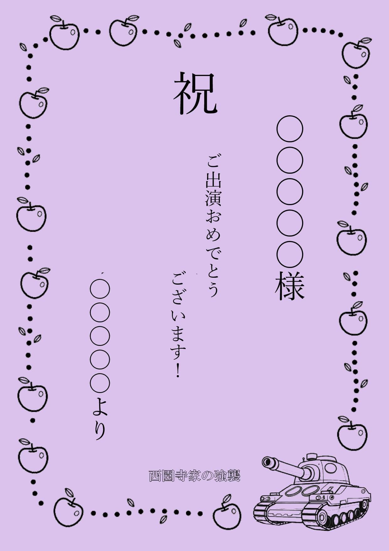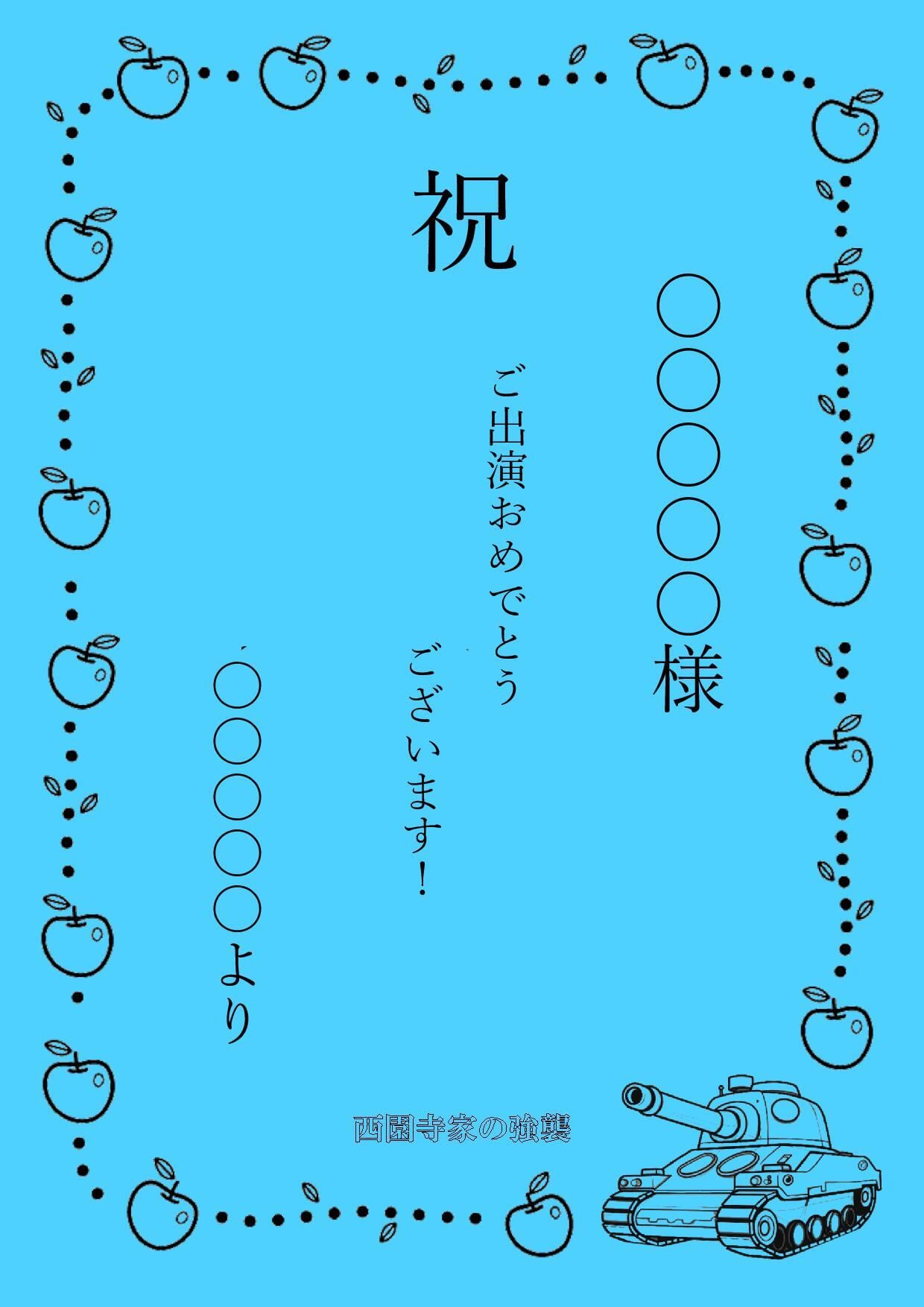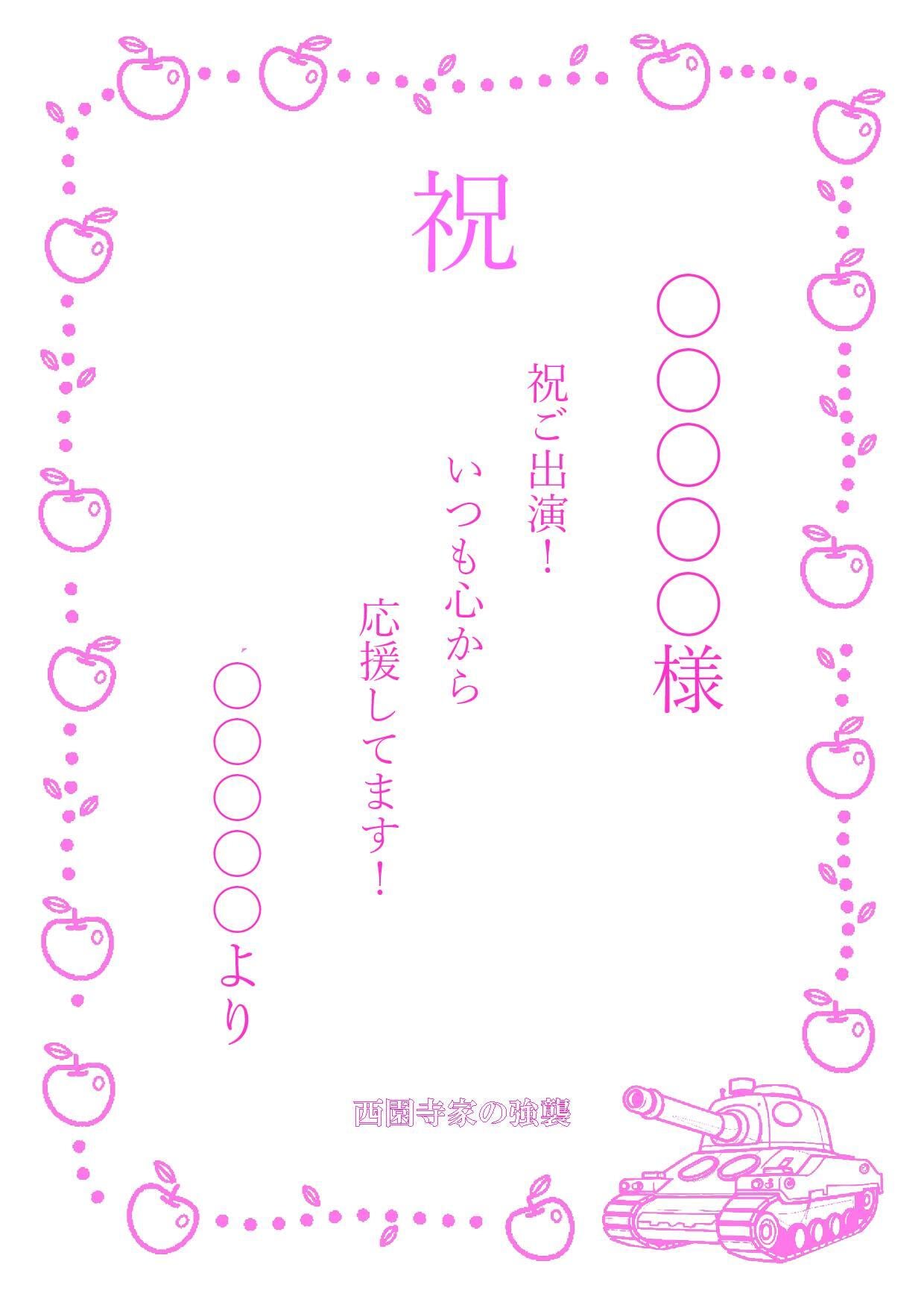 ・商品選択時に「応援メッセージ」を選択頂き、30文字までメッセージを入力できます。未入力の場合自動で「ご出演おめでとうございます!」にさせて頂きます。