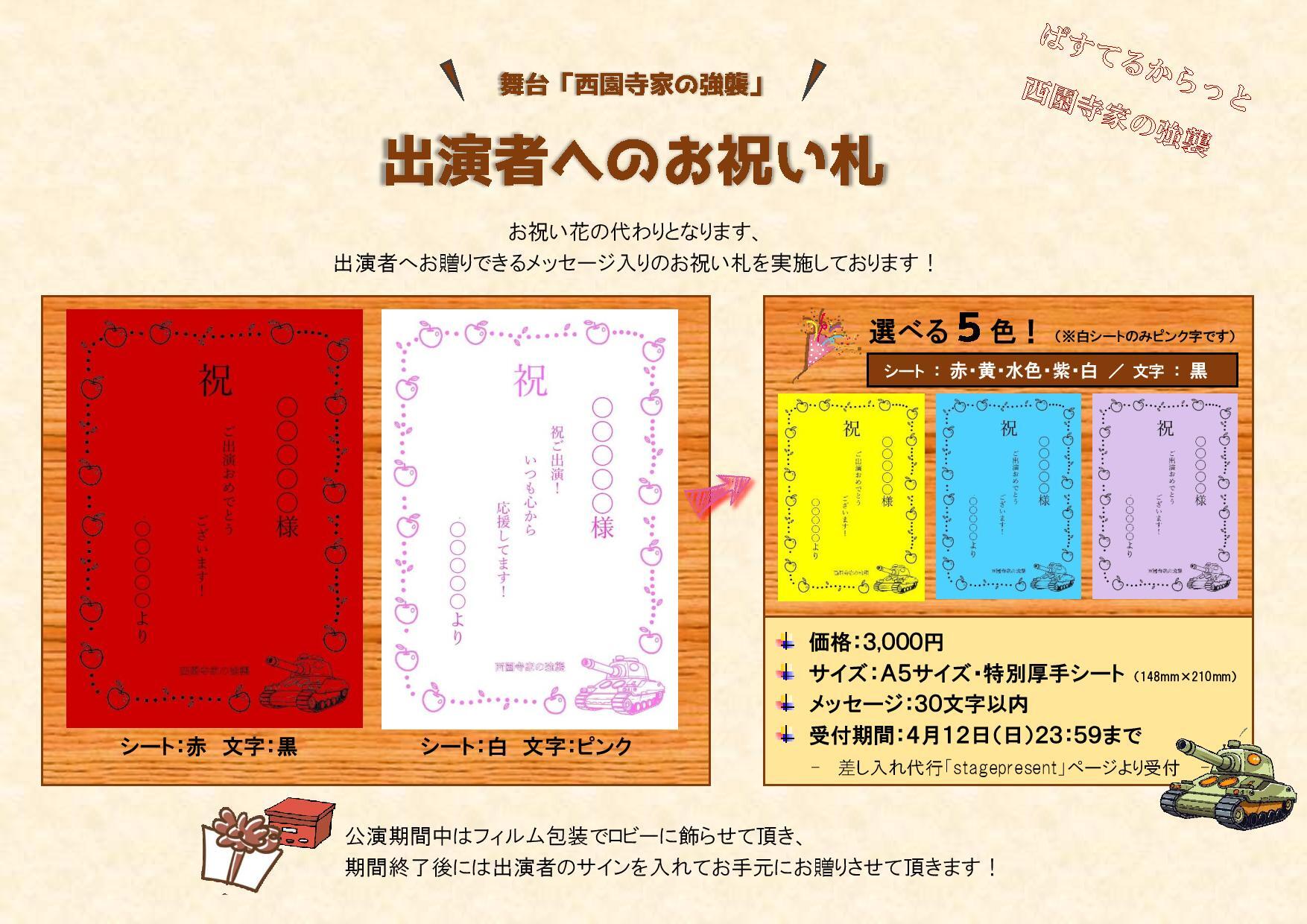 出演者へお贈りできるメッセージ入りのお祝い札を実施いたします。